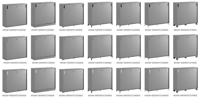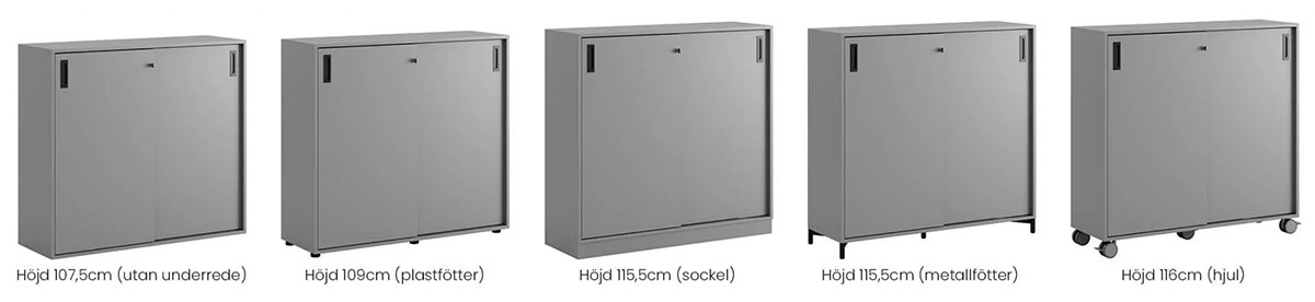 Skap med skyvedører i Modify-serien er designet for kunder som ønsker mange valg. Vi tilbyr 4 forskjellige størrelser på skap med skyvedører med 5 forskjellige valg av chassis: ramme uten chassis, sokkel, plastføtter, stålben eller hjul. De forskjellige valgene av chassis er tilgjengelig i forskjellige farger. Velg også fargen på håndtaket for å lage en rekke alternativer.
