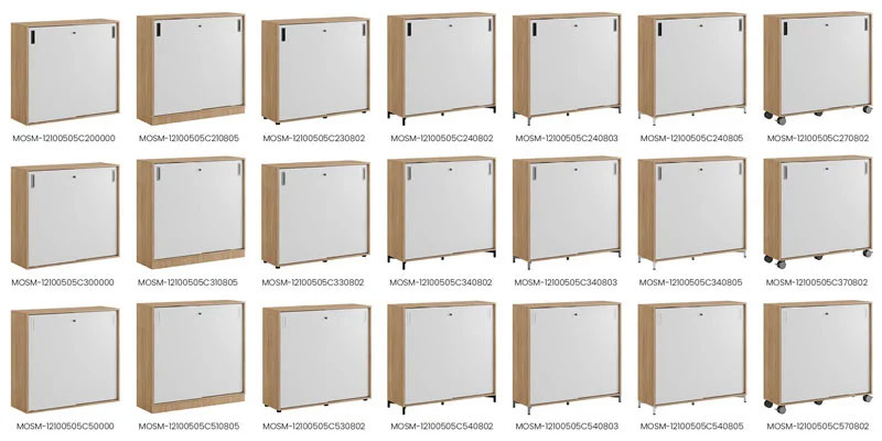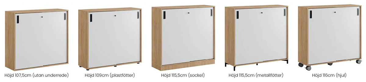Skap med skyvedører i Modify-serien er designet for kunder som ønsker mange valg. Vi tilbyr 4 forskjellige størrelser på skap med skyvedører med 5 forskjellige valg av chassis: ramme uten chassis, sokkel, plastføtter, stålben eller hjul. De forskjellige valgene av chassis er tilgjengelig i forskjellige farger. Velg også fargen på håndtaket for å lage en rekke alternativer.