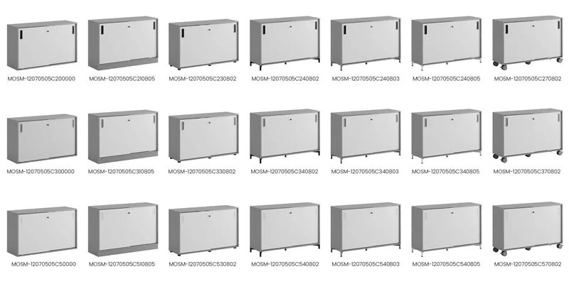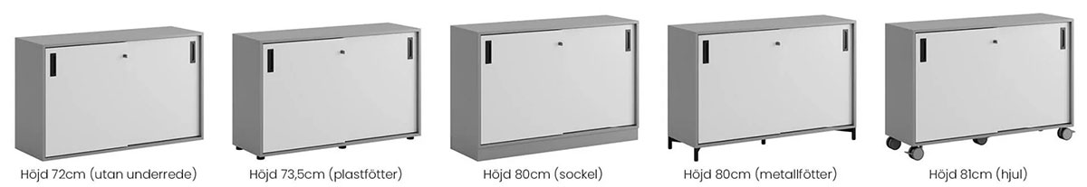 Skap med skyvedører i Modify-serien er designet for kunder som ønsker mange valg. Vi tilbyr 4 forskjellige størrelser på skap med skyvedører med 5 forskjellige valg av chassis: ramme uten chassis, sokkel, plastføtter, stålben eller hjul. De forskjellige valgene av chassis er tilgjengelig i forskjellige farger. Velg også fargen på håndtaket for å lage en rekke alternativer.