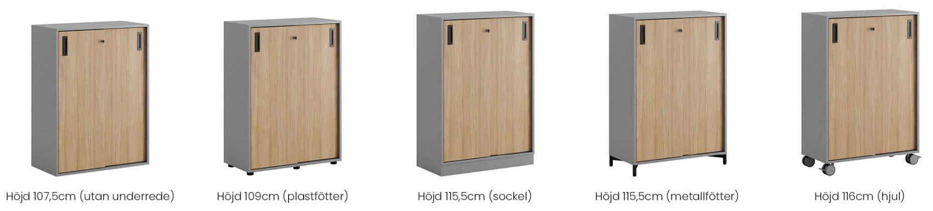 Skap med skyvedører i Modify-serien er designet for kunder som ønsker mange valg. Vi tilbyr 4 forskjellige størrelser på skap med skyvedører med 5 forskjellige valg av chassis: ramme uten chassis, sokkel, plastføtter, stålben eller hjul. De forskjellige valgene av chassis er tilgjengelig i forskjellige farger. Velg også fargen på håndtaket for å lage en rekke alternativer.