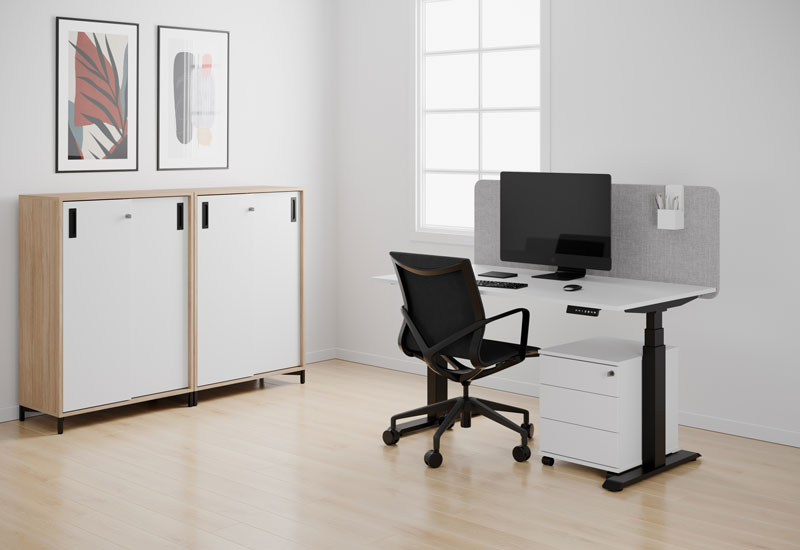 Skap med skyvedører er et naturlig element på kontoret og i det åpne kontorlandskapet. Skjul ladere og lapp-lapper, dokumenter og private gjenstander slik at skrivebordet holder seg rent og ryddig. Det er smarte alternativer for dokumenthåndtering slik at strukturen blir enda bedre.