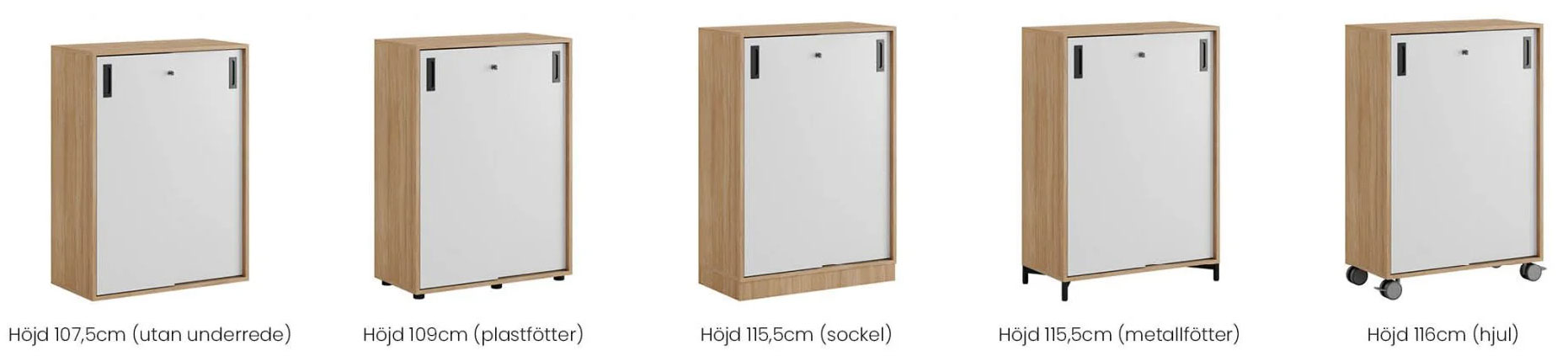 Skap med skyvedører i Modify-serien er designet for kunder som ønsker mange valg. Vi tilbyr 4 forskjellige størrelser på skap med skyvedører med 5 forskjellige valg av chassis: ramme uten chassis, sokkel, plastføtter, stålben eller hjul. De forskjellige valgene av chassis er tilgjengelig i forskjellige farger. Velg også fargen på håndtaket for å lage en rekke alternativer.