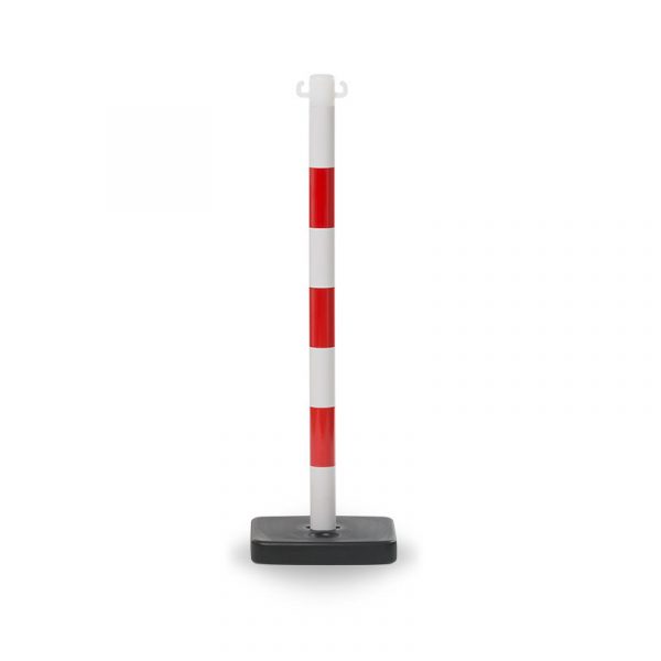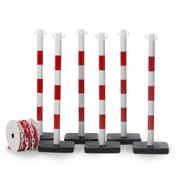 Settet inneholder 6 stolper, 25 meter rød/hvit plastkjetting og plastbeholdere som du fyller med sand eller vann for å skape stabilitet.